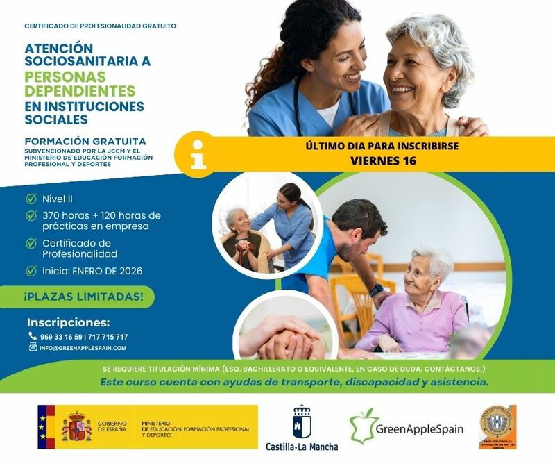 También permanece abierto hasta el 16 de enero el plazo de inscripción para el Certificado de Profesionalidad en Atención Sociosanitaria a Personas Dependientes en Instituciones Sociales, de nivel II, dirigido a personas interesadas en trabajar en residencias, centros de día e instituciones sociales. Esta formación incluye 370 horas lectivas y 120 horas de prácticas, y requiere contar con titulación mínima, como ESO, Bachillerato o equivalente.
