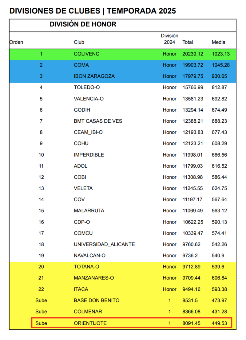 La Federación Española de Orientación (FEDO) ha publicado el ranking actualizado de O-Pie para la temporada 2025, en el que se incluye la nueva división de clubes. Entre las novedades, destaca el ascenso del CD Orientijote a la División de Honor, máxima categoría de esta disciplina en España. Este ascenso refleja el esfuerzo colectivo del equipo y su constante crecimiento en el ámbito deportivo.