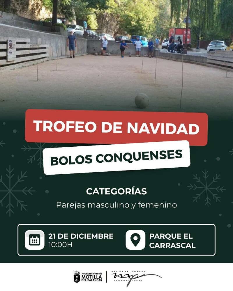 El domingo 21 de diciembre se celebrará en el Parque El Carrascal una nueva edición del Trofeo de Navidad de Bolos Conquenses, con categorías de parejas masculinas y femeninas. Las inscripciones estarán abiertas a partir de las 10:00 horas, en una jornada deportiva con ambiente navideño en Motilla del Palancar.