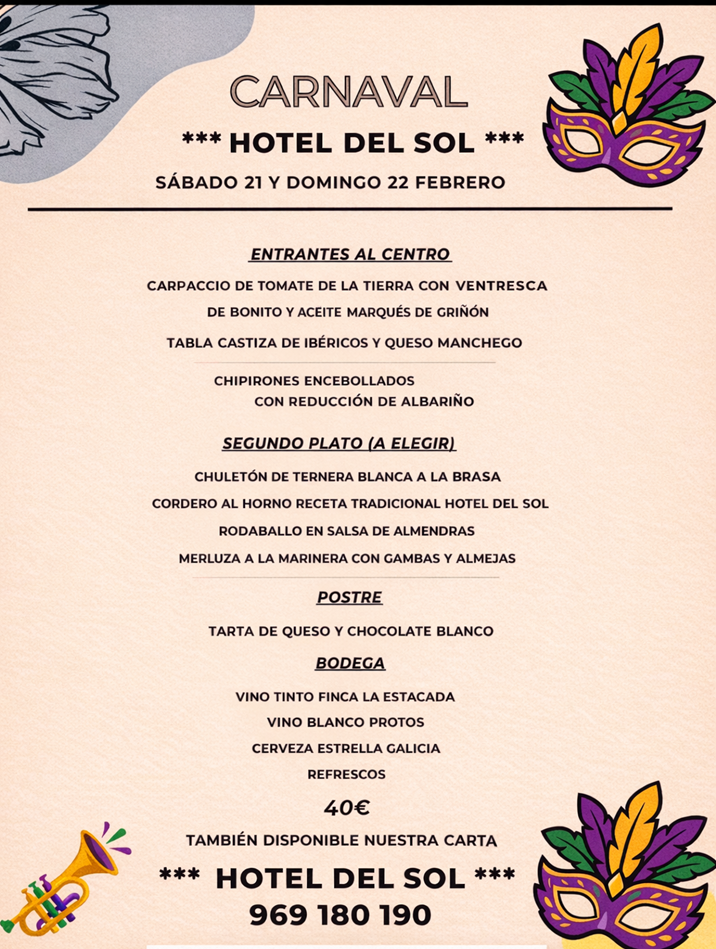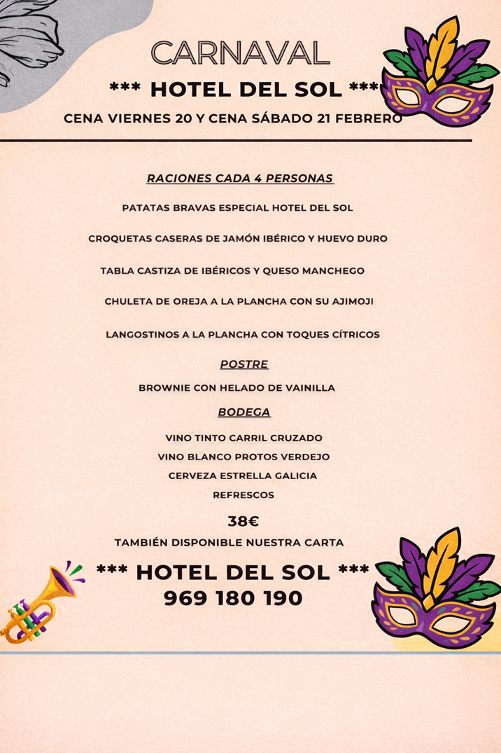 El Carnaval es una de esas fechas que invitan a salir de la rutina, disfrutar del ambiente festivo y compartir buenos momentos. Y este año, el Hotel del Sol ha preparado una propuesta perfecta para quienes quieren celebrarlo como se merece: una cena especial los días viernes 20 y sábado 21 de febrero, con un menú pensado para disfrutar en familia o con amigos.
