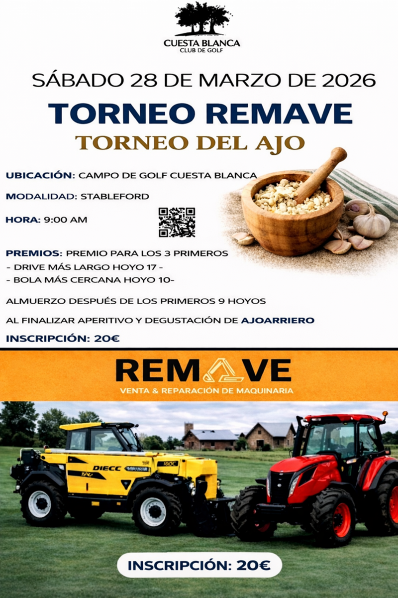 El próximo sábado 28 de marzo de 2026 el Campo de Golf Cuesta Blanca celebrará una nueva jornada deportiva y social con la disputa del “Torneo Remave – Torneo del Ajo”, una cita que combinará competición golfística con gastronomía y convivencia entre los participantes.