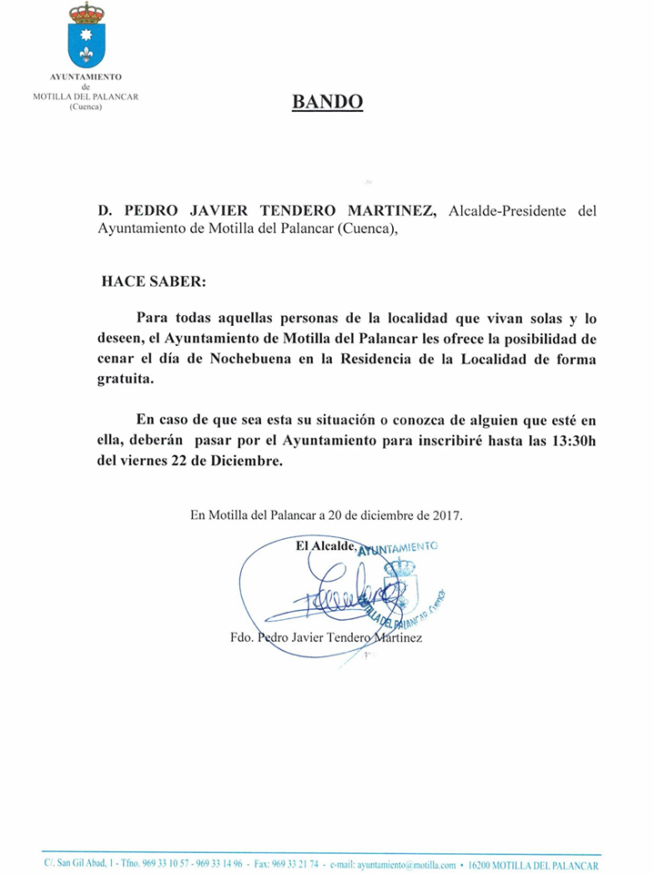El Ayuntamiento de Motilla del Palancar ha enviado un comunicado para las personas que vayan a pasar una Nochebuena solos.