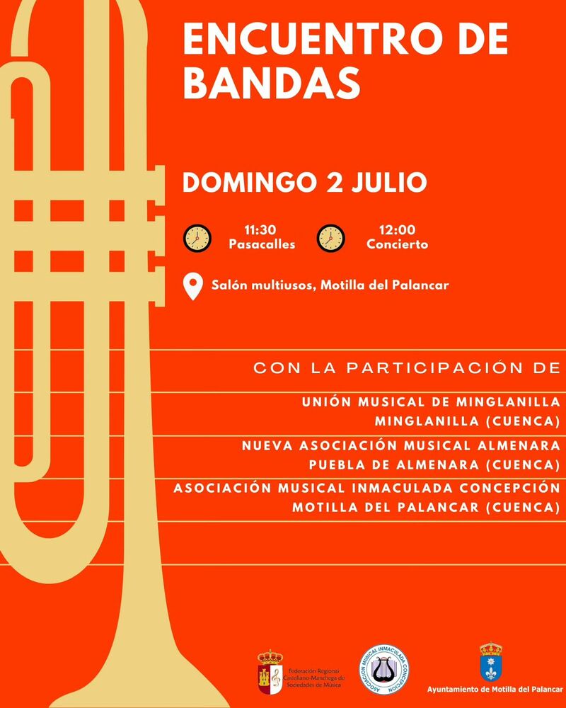 Hoy domingo, Motilla del Palancar se convertirá en el escenario perfecto para un espectáculo musical que no te puedes perder. La Banda Inmaculada Concepción de Motilla del Palancar será la anfitriona de un emocionante Encuentro de Bandas que contará con la participación de la Unión Musical de Minglanilla y la Nueva Asociación Musical de Puebla de Almenara.