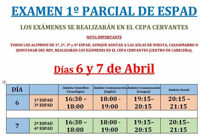 El C.E.P.A Cervantes ha comunicado a través de sus redes sociales los examenes que se llevarán a cabo durante los días 6 y 7 de Abril a partir de las 16:30h.
