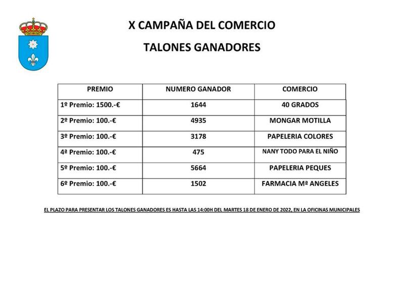 El plazo para presentar dichos talones premiados finaliza el martes 18 de Enero, a las 14 horas.