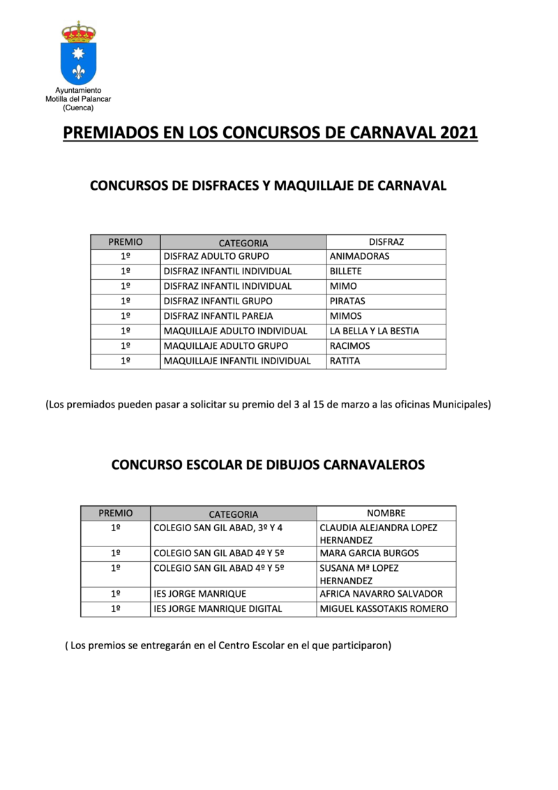 El Ayuntamiento ha hecho oficial los ganadores de las tres categorías del Caranval Digital 2021 de Motilla del Palancar.