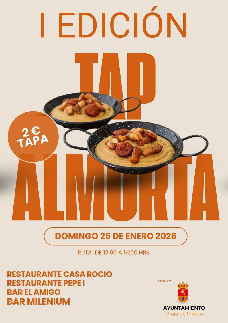 La gastronomía manchega será la gran protagonista en Graja de Iniesta el próximo domingo 25 de enero, con la celebración de la I Ruta de la TapAlmorta, una propuesta que invita a recorrer los bares y restaurantes del municipio degustando uno de los platos más representativos de la cocina tradicional.