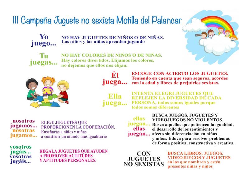 El Ayuntamiento de Motilla del Palancar apuesta por tercer año consecutivo por la III Campaña Juguete no sexista 2019 para escoger con acierto los juguetes teniendo en cuenta: que sean seguros, acordes a su edad y libres de perjuicios sexistas. También es muy importante que sean educativos, participativos y nada violentos.