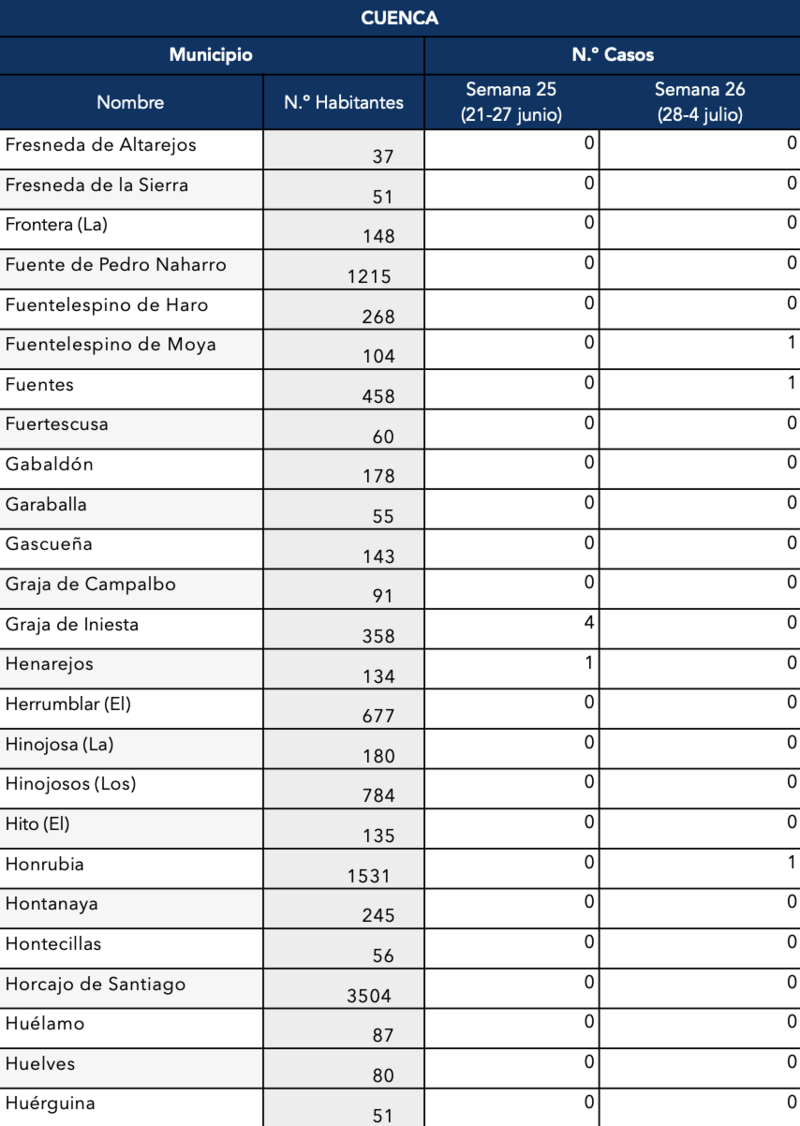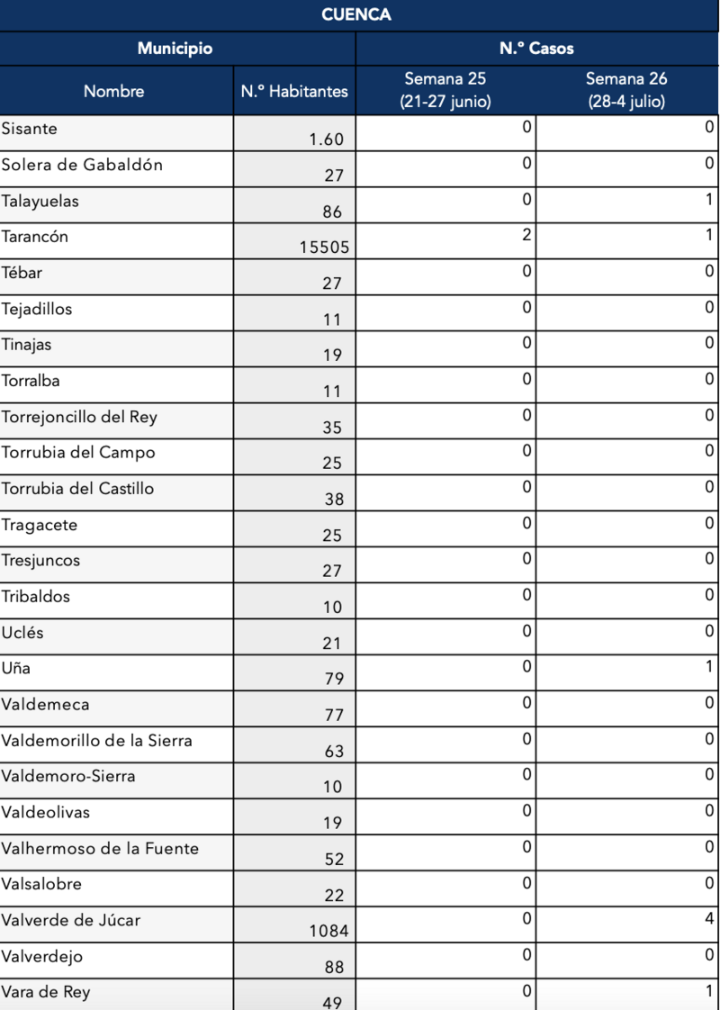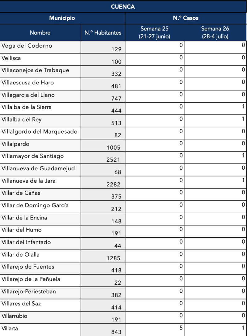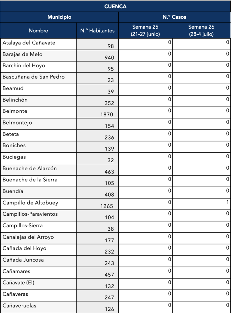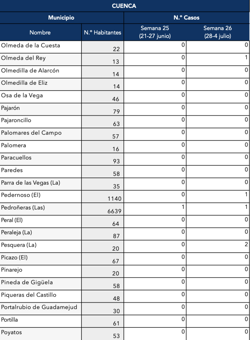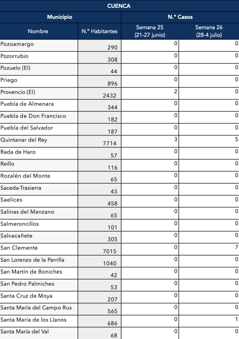 El Gobierno de Castilla-La Mancha, a través de la Dirección General de Salud Pública, ha confirmado que el municipio de Motilla del Palancar cuenta con 6 casos de coronavirus. Estos corresponden a la semana epidemiológica 26 (del 28 al 4 de julio), por lo que NO entran los posibles positivos que puedan haber aparecido desde el 4 de julio hasta este jueves 8.