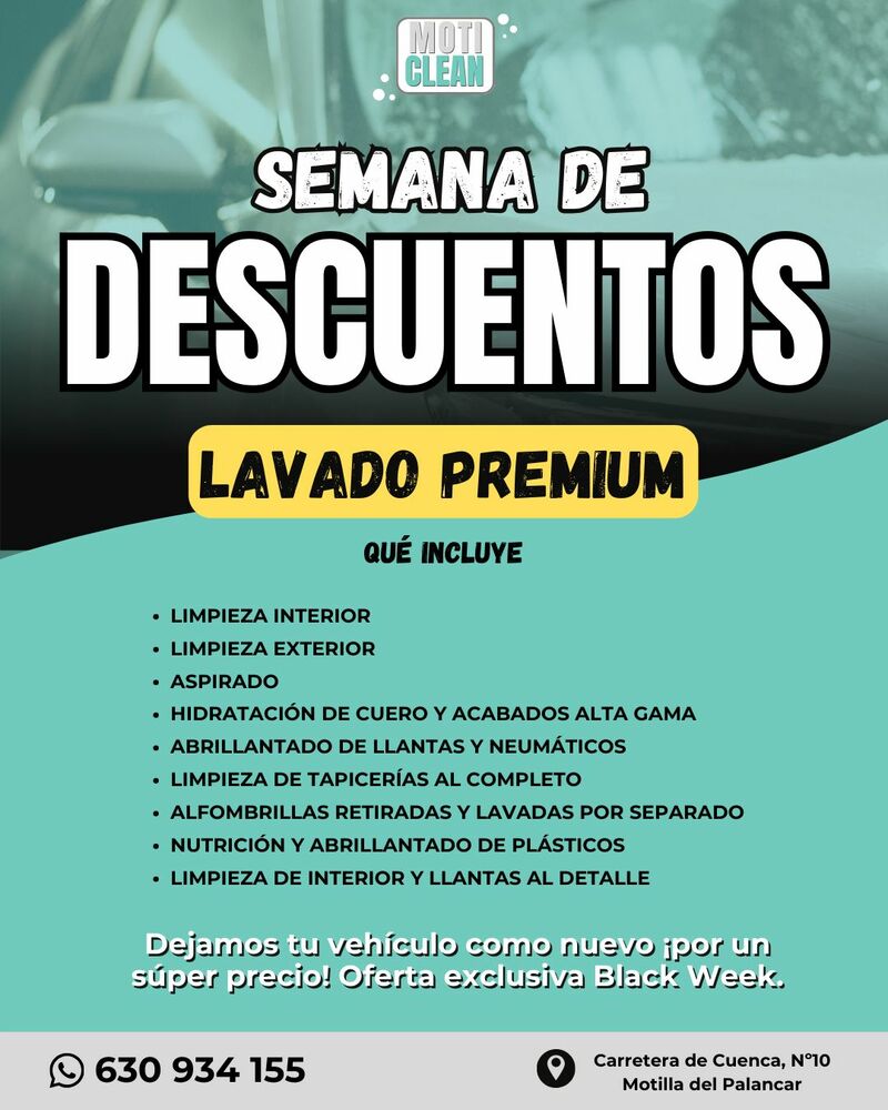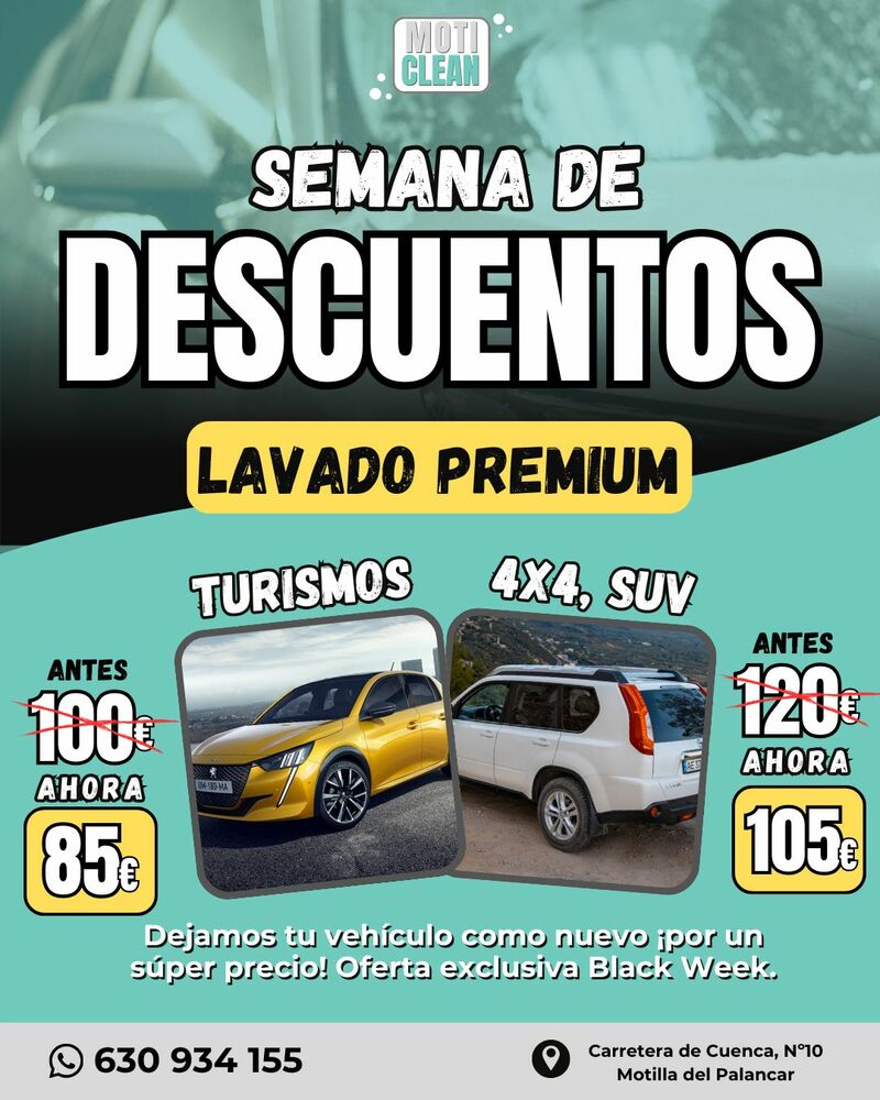 Moti Clean ha lanzado su promoción especial de Black Week con descuentos en el servicio de lavado premium. La campaña, disponible durante esta semana, reduce los precios tanto para turismos como para vehículos 4x4 y SUV en su centro de lavado manual situado en la Carretera de Cuenca número 10, en Motilla del Palancar.