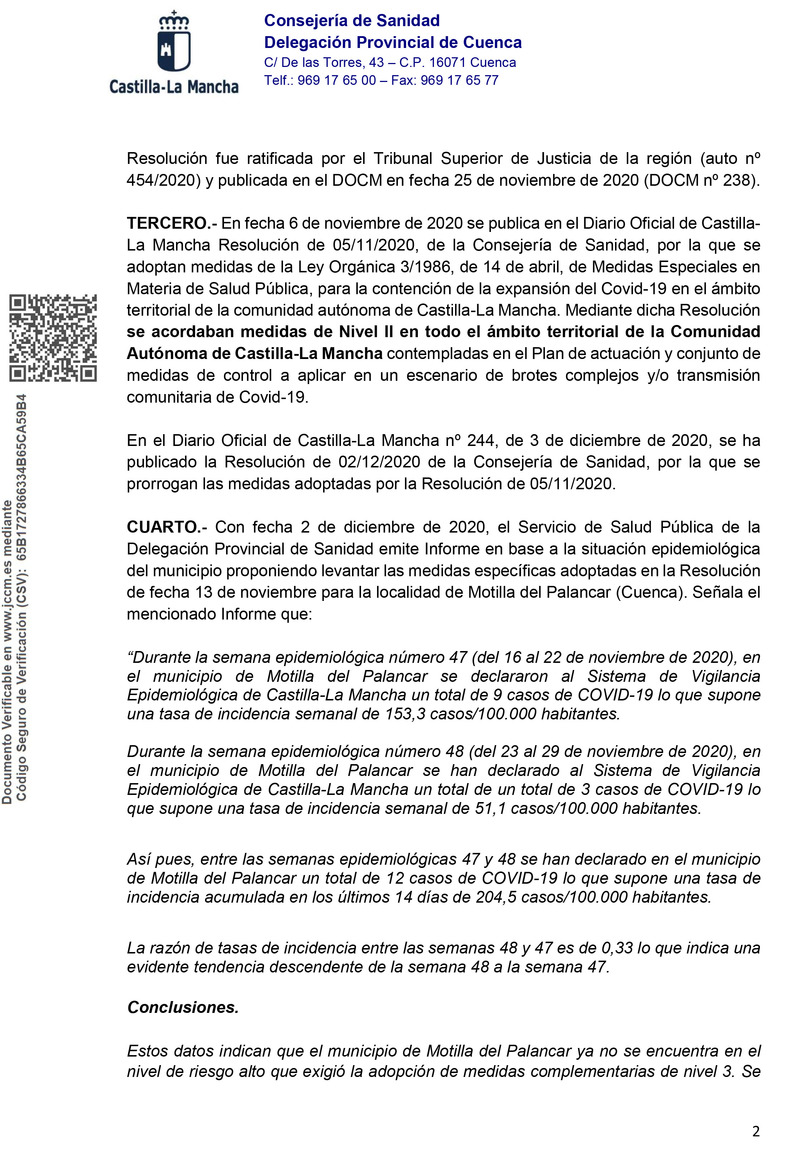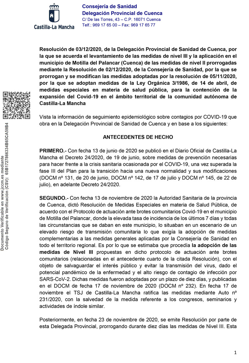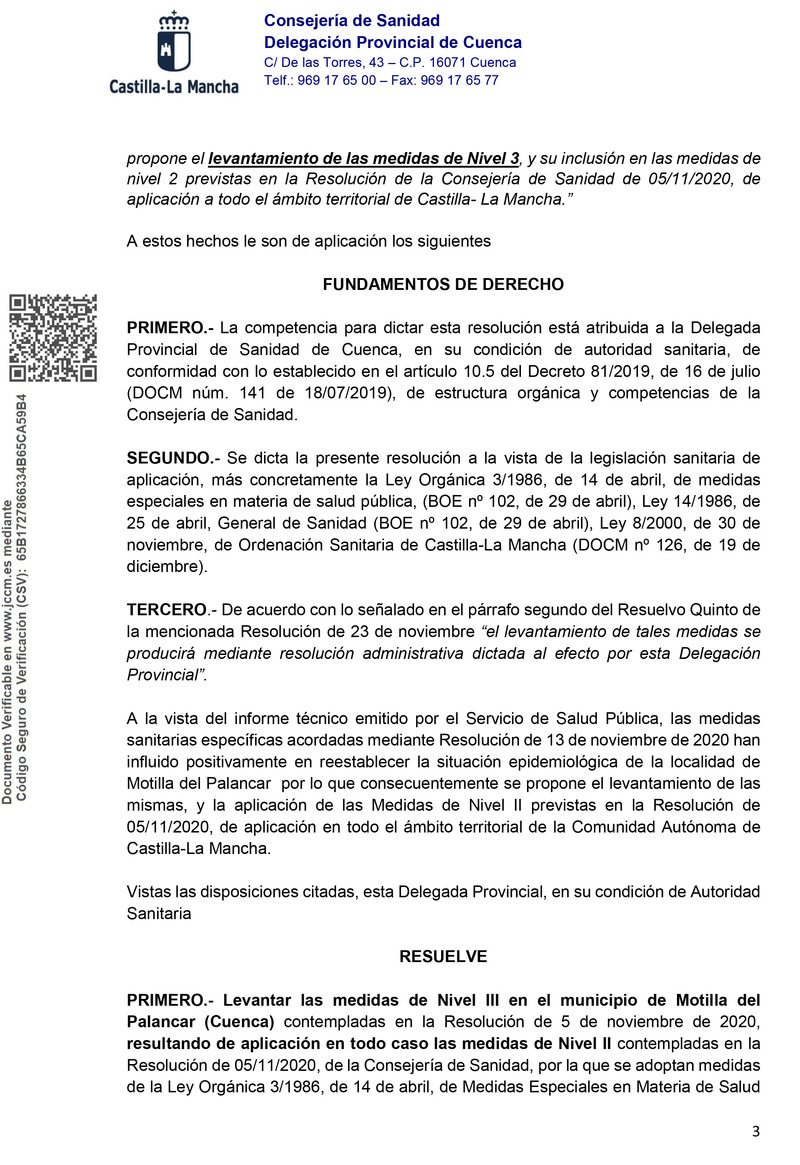 Hoy 3 de Diciembre se ha comunicado desde la Consejería de Sanidad de la Delegación Provincial de Cuenca, el levantamiento de las medidas de Nivel III que se encontraban vigentes en la localidad de Motilla del Palancar.