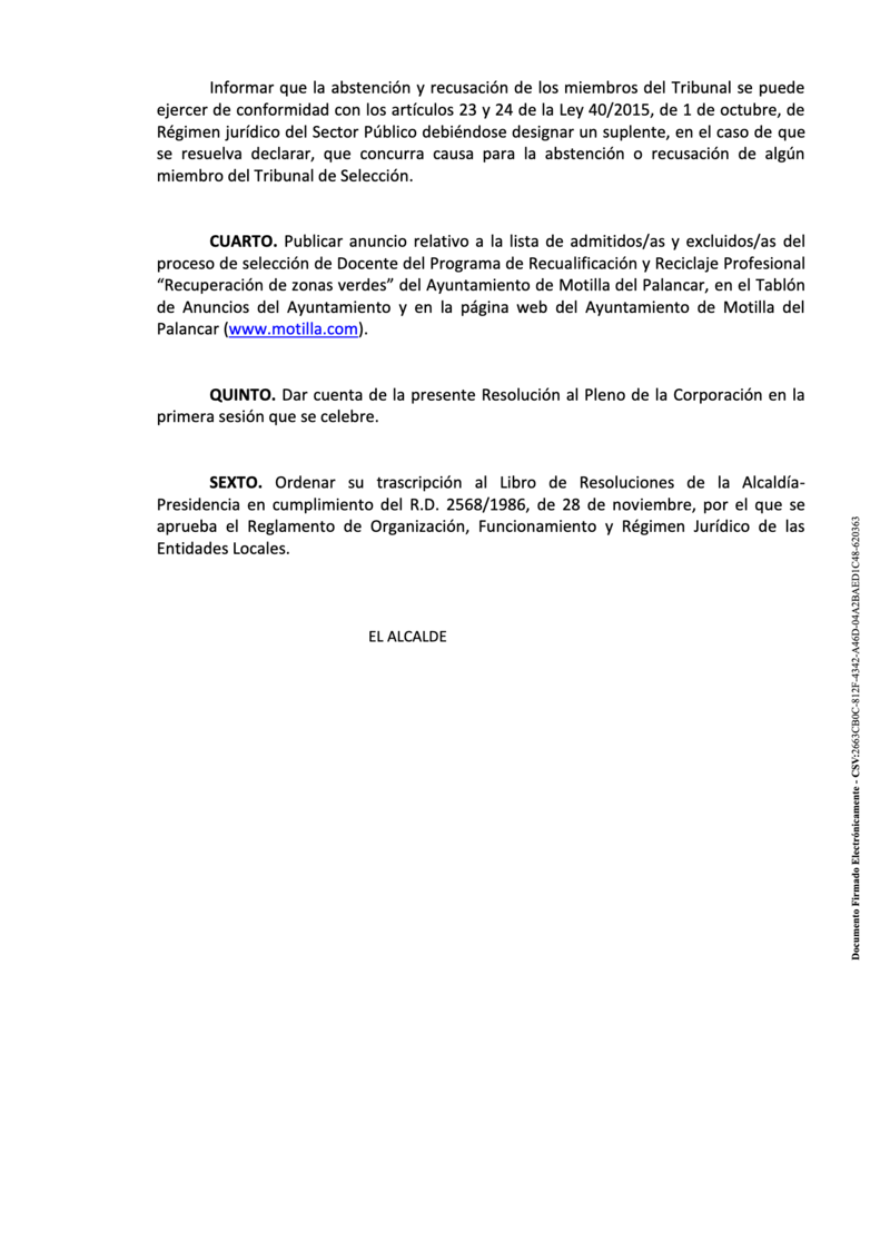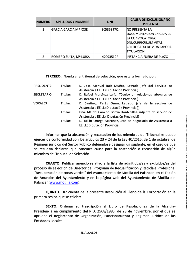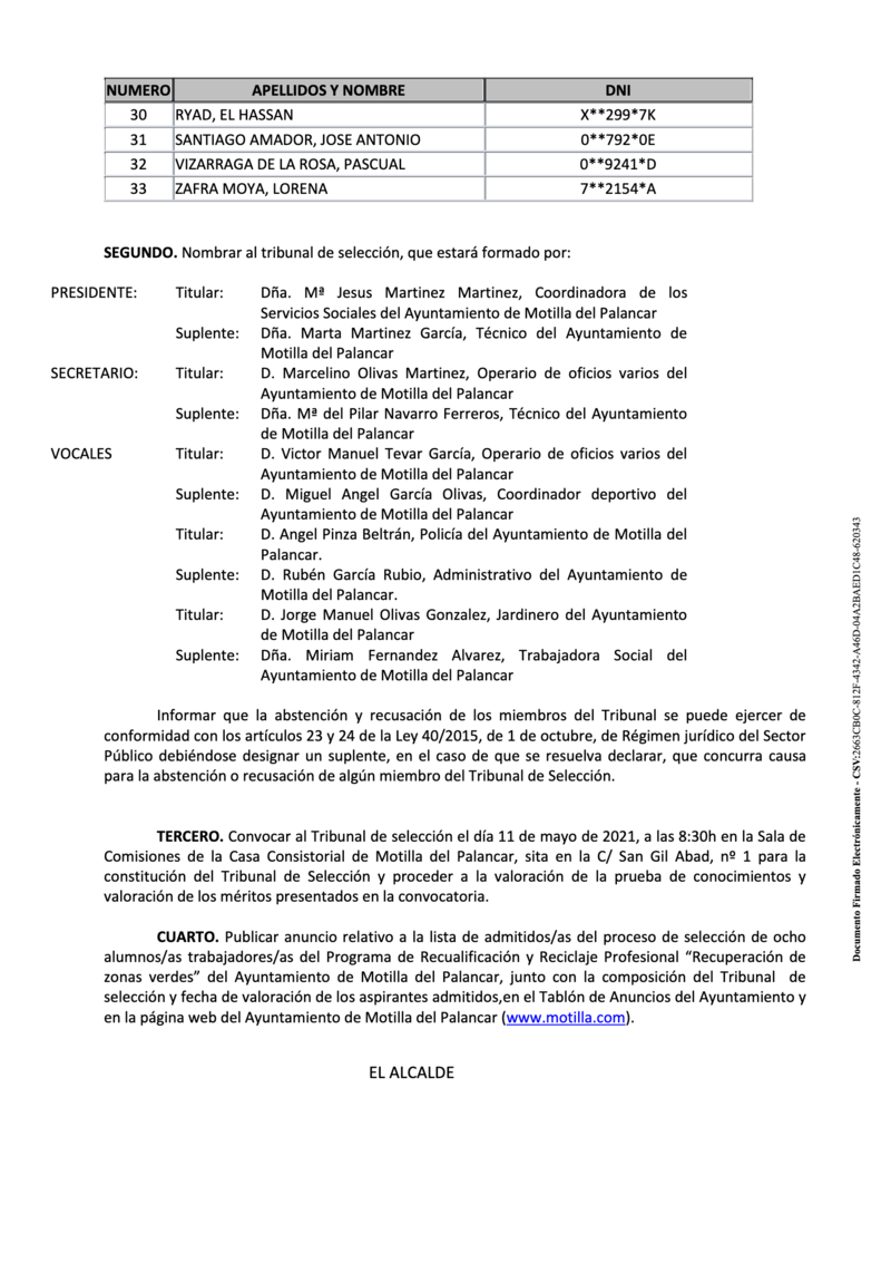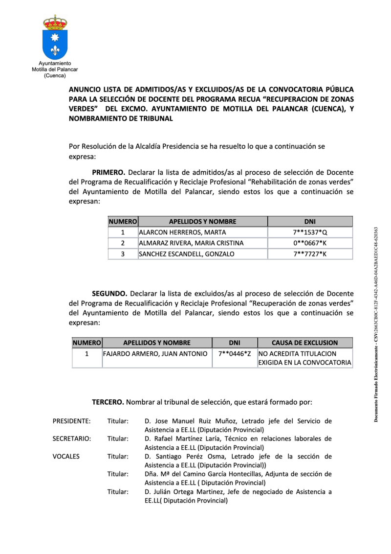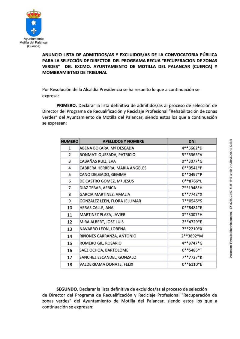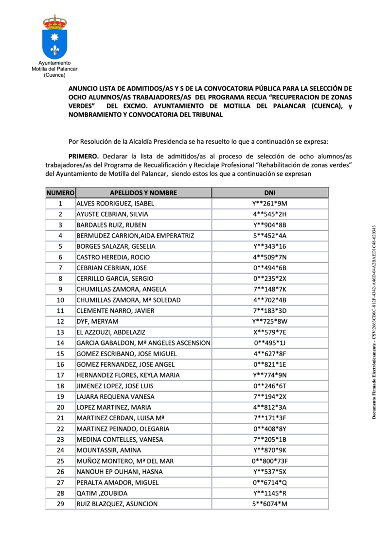 El Ayuntamiento de Motilla del Palancar ha publicado las listas para la selección de ocho alumnos/as, director y personal docente para el programa RECUA "Recuperación de zonas verdes".