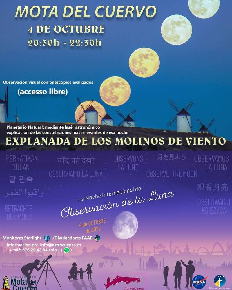 Este 4 de octubre de 2025, Mota del Cuervo se suma a la Noche Internacional de Observación de la Luna con un evento especial que tendrá lugar en la explanada de los Molinos de Viento, entre las 20:30 y las 22:30 horas.