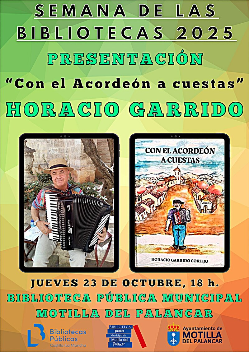 El jueves 23 de octubre, también a las 18:00 horas, el músico y escritor Horacio Garrido Cortijo compartirá con el público su primer libro, “Con el acordeón a cuestas”, acompañado de un breve concierto con su acordeón.
