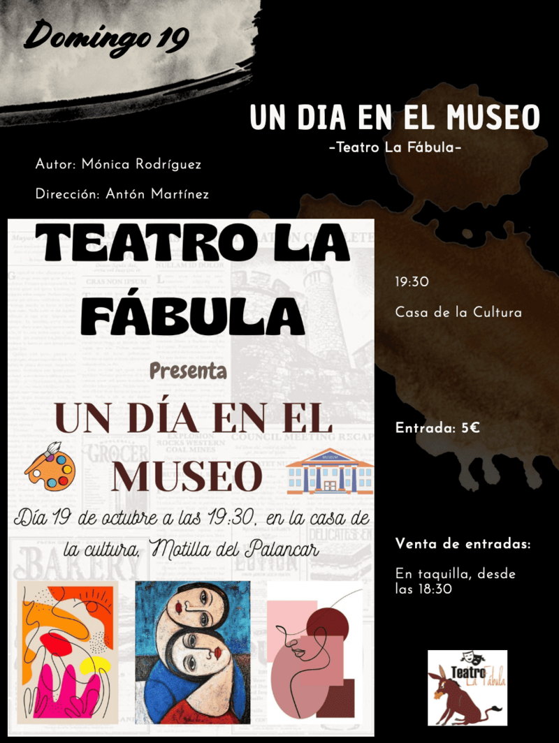Por último, el domingo 19 de octubre, el Teatro La Fábula cerrará el festival con Un día en el museo, de Mónica Rodríguez, dirigida por Antón Martínez. La función comenzará a las 19:30 horas y está pensada para todos los públicos, con un precio de 5 euros.