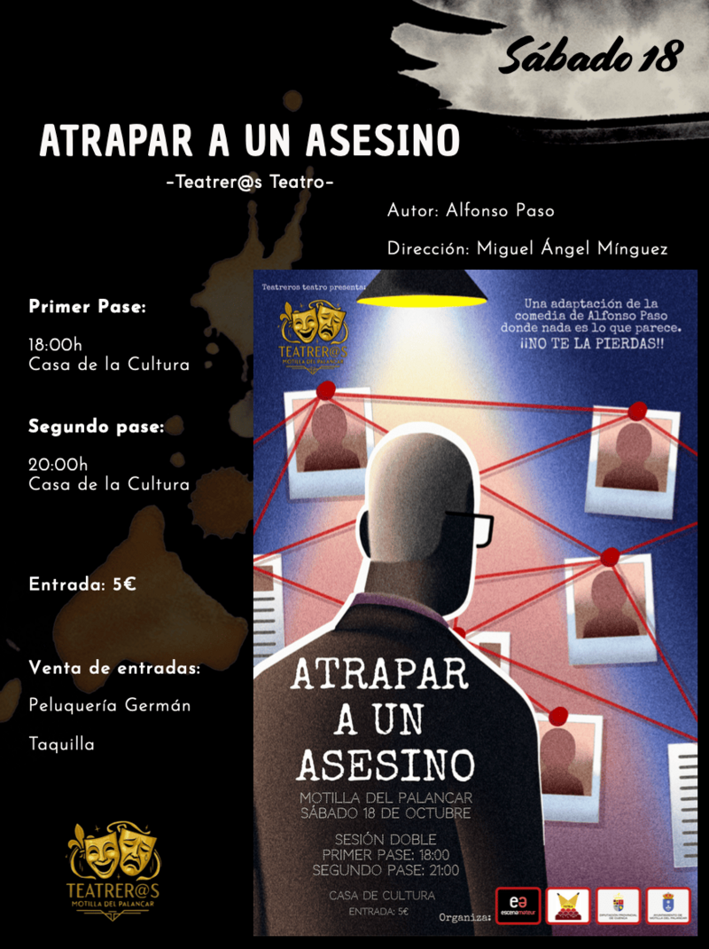 El sábado 18 se vivirá una jornada doble con la comedia Atrapar a un asesino, de Alfonso Paso, interpretada por Teatrer@s Teatro y dirigida por Miguel Ángel Mínguez. La obra se representará en dos pases: a las 18:00 y 21:00 horas, en la Casa de la Cultura, con entradas a 5 euros, disponibles en taquilla y en Peluquería Germán.
