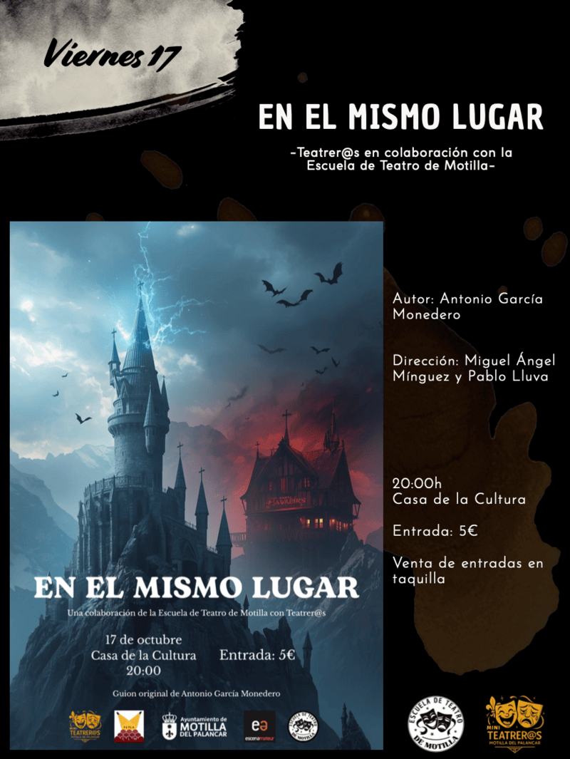 El viernes 17, los protagonistas serán los grupos locales con el estreno de En el mismo lugar, una colaboración entre Teatrer@s Teatro y la Escuela de Teatro de Motilla, con guion original de Antonio García Monedero y dirección de Miguel Ángel Mínguez y Pablo Lluva. La función comenzará a las 20:00 horas y la entrada costará 5 euros.