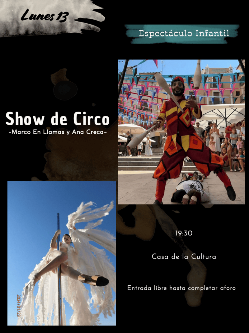 La jornada del lunes 13 de octubre estará dedicada a los más pequeños con un show de circo protagonizado por Marco en Llamas y Ana Creca, una propuesta llena de humor, acrobacias y fantasía, con entrada libre hasta completar aforo.
