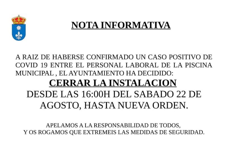 Al parecer, la persona contagiada trabaja en las instalaciones de la piscina municipal, lo que ha obligado al Ayuntamiento ha decretar el cierre de la misma.