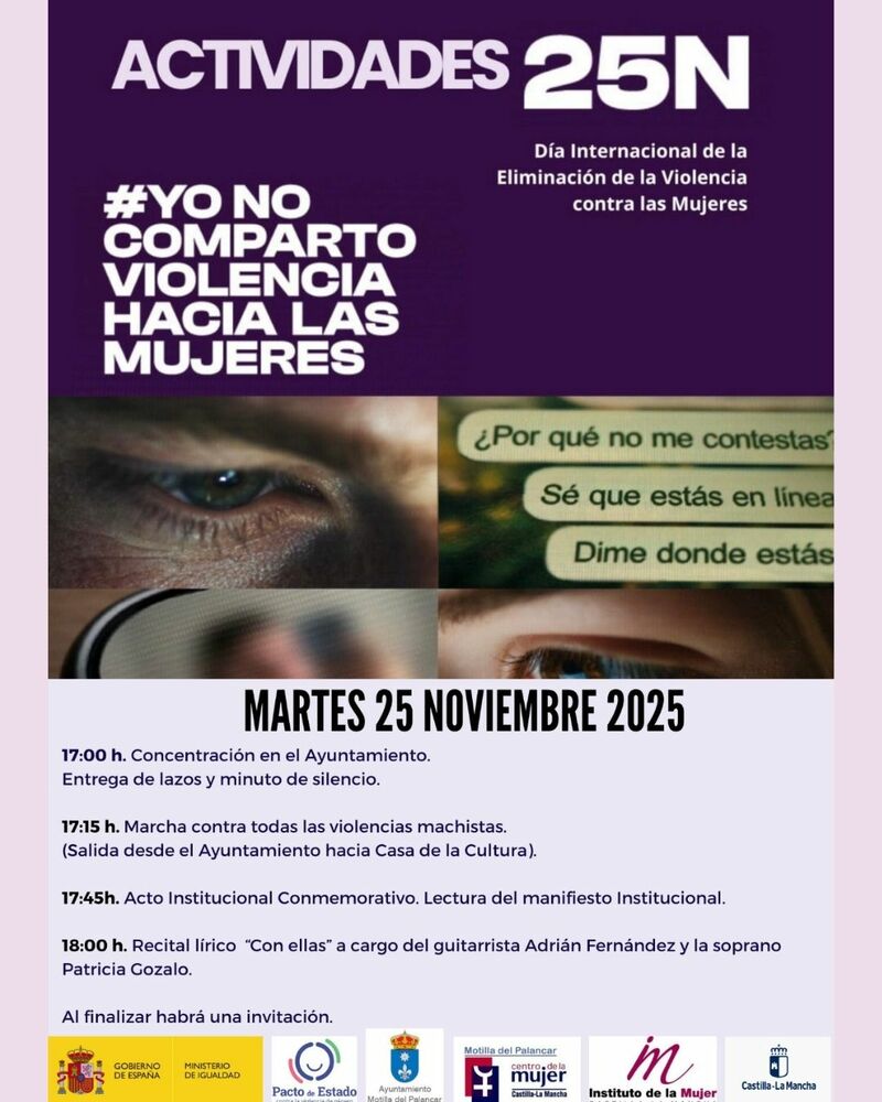 Motilla del Palancar se suma hoy, 25 de noviembre, a los actos del Día Internacional de la Eliminación de la Violencia contra las Mujeres, una fecha clave que cada año moviliza a instituciones y ciudadanía para denunciar la violencia machista y apoyar a las víctimas. La jornada incluye una concentración, una marcha, un acto institucional y un recital lírico, actividades pensadas para visibilizar la importancia de la prevención y la sensibilización.