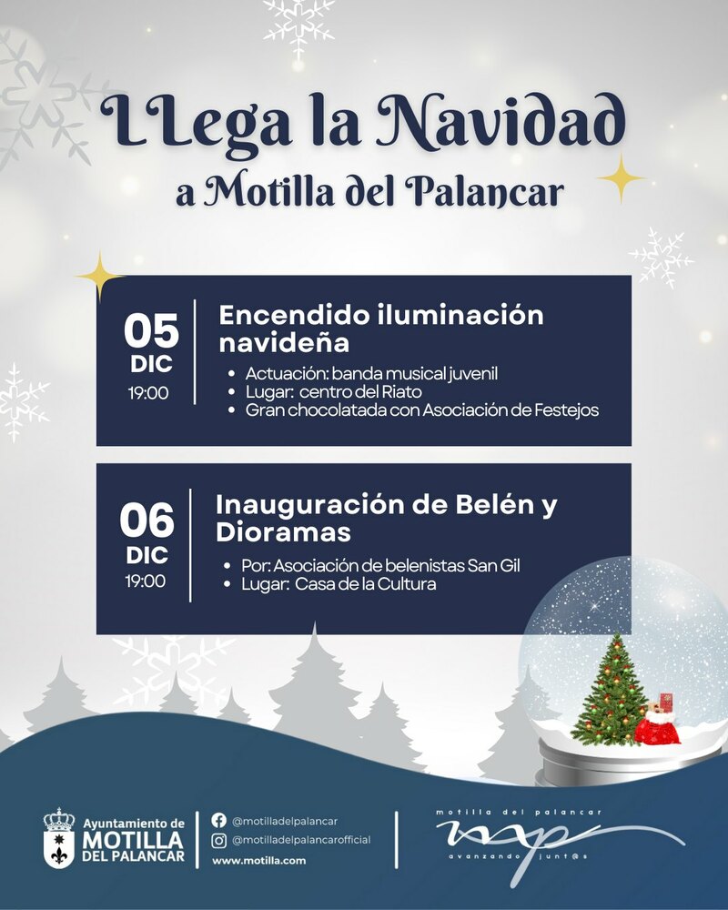 Llega la Navidad a Motilla del Palancar con dos actividades destacadas este fin de semana: el encendido de la iluminación navideña en el centro del Riato y la inauguración del Belén y los dioramas en la Casa de la Cultura. Ambos eventos marcan el inicio oficial de las celebraciones en el municipio.
