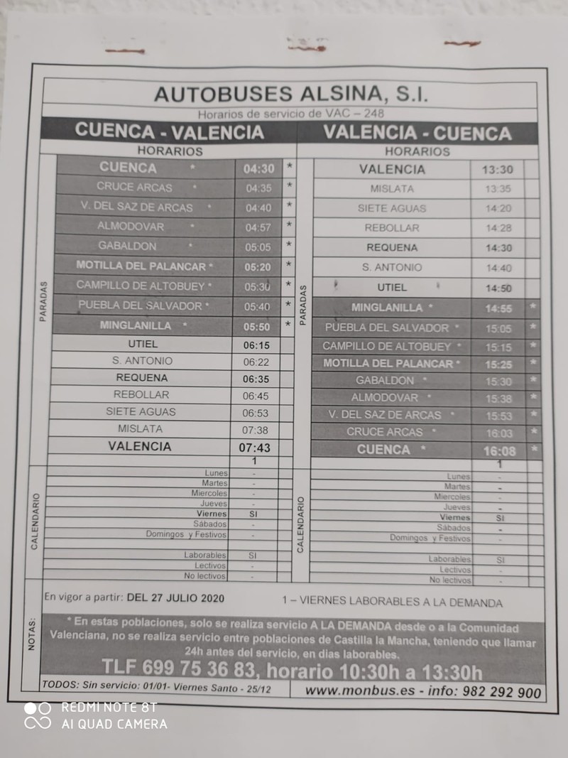 Desde Motilla del Palancar App os informamos que desde el pasado 27 de Julio, las líneas de autobuses Cuenca-Valencia y Valencia-Cuenca vuelven a estar en activo. En esta ocasión, sólo funcionarán un día a la semana, todos los viernes y quedarían así: