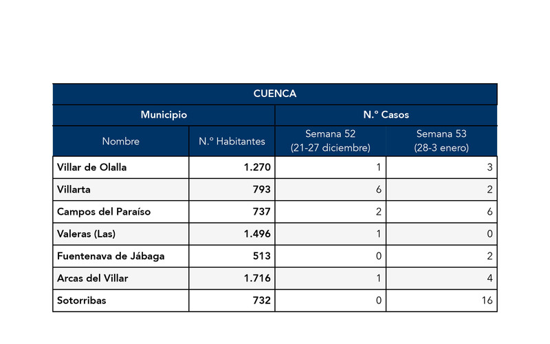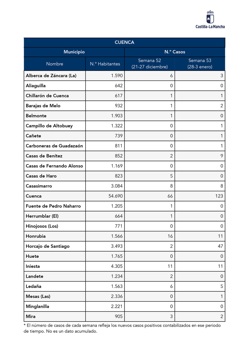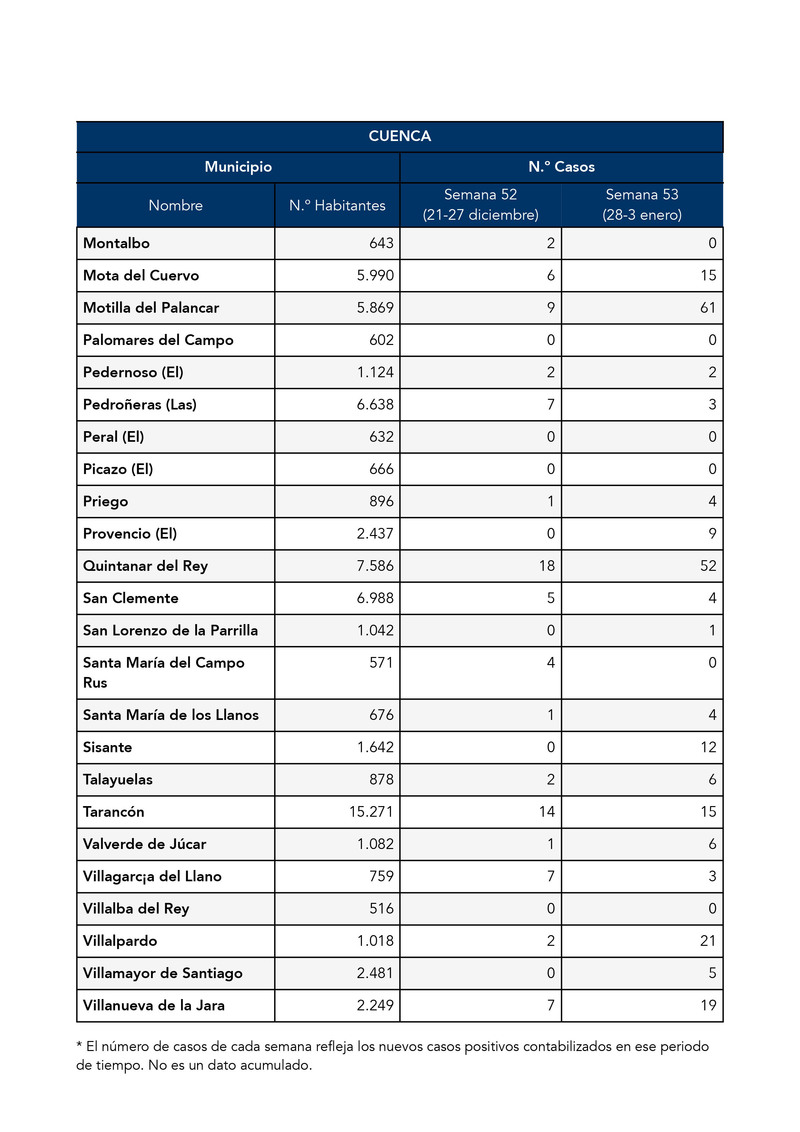 El Gobierno de Castilla-La Mancha, a través de la Dirección General de Salud Pública, ha confirmado 61 nuevos casos en la localidad motillana. Estos casos de Covid-19 corresponden a la semana epidemiológica 53, del 28 de diciembre al 3 de enero.