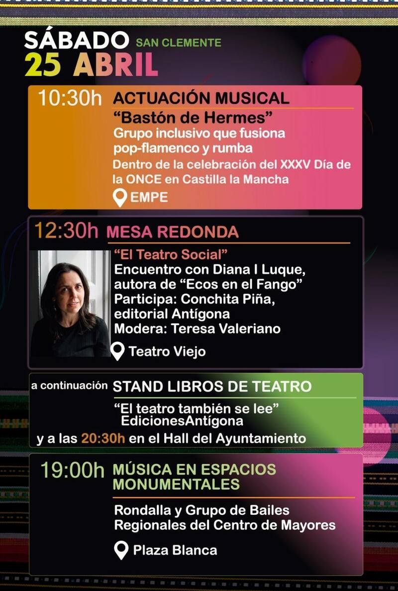 La agenda cultural del fin de semana del 24 al 26 de abril llega con propuestas variadas en distintos municipios de la comarca. Teatro, música en directo, cine, actividades tecnológicas, ferias y gastronomía forman parte de una programación pensada para todos los públicos en localidades como Motilla del Palancar, Quintanar del Rey, Iniesta, Casas Ibáñez, San Clemente, Villanueva de la Jara y El Peral.