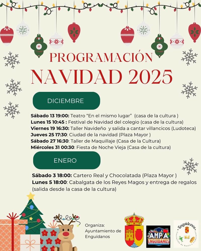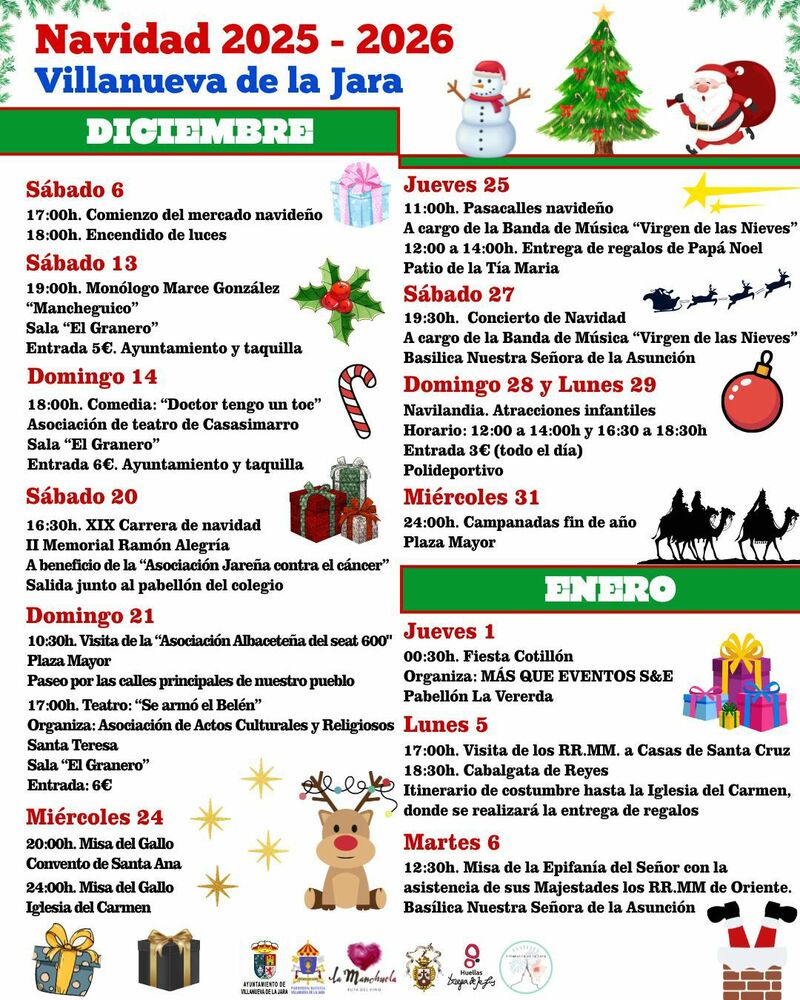 La programación de Navidad 2025-2026 en varios municipios de la provincia de Cuenca ya está en marcha con decenas de actividades culturales, deportivas e infantiles. Campillo de Altobuey, El Peral, Ledaña, Iniesta, Minglanilla, Enguídanos, El Picazo, San Clemente, Villanueva de la Jara, Quintanar del Rey, Mota del Cuervo, Huete y Beteta presentan agendas con conciertos, teatro, mercadillos navideños, navilandia, cine, carreras populares y cabalgatas de Reyes Magos.