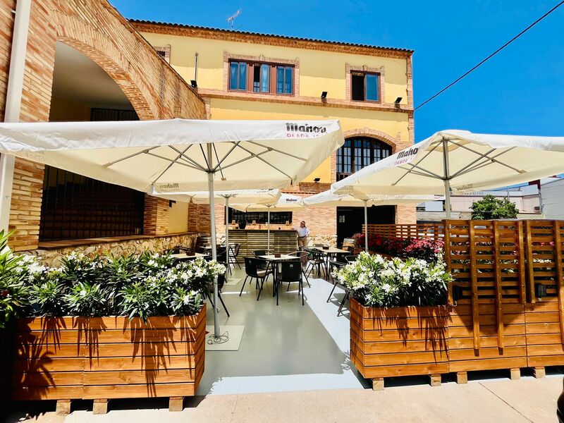 La terraza destaca por su diseño acogedor, con sombrillas, zonas ajardinadas y un entorno pensado para el confort. Un espacio al aire libre que combina estética y funcionalidad, ideal tanto para grupos como para planes más relajados.