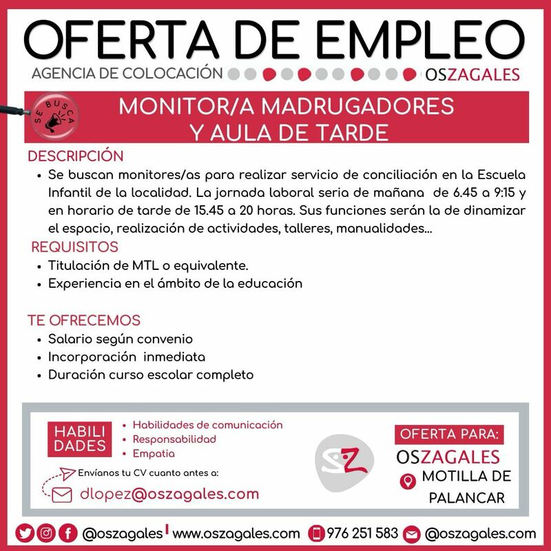 La agencia de colocación Oszagales está en búsqueda de monitores y monitoras para cubrir servicios de madrugadores y aula de tarde en la escuela infantil de Motilla del Palancar. Se trata de una oferta de empleo ideal para aquellos con titulación en MTL o equivalente y experiencia en el sector de la educación. El horario laboral cubre tanto la mañana como la tarde, ofreciendo una excelente oportunidad de empleo en la localidad.