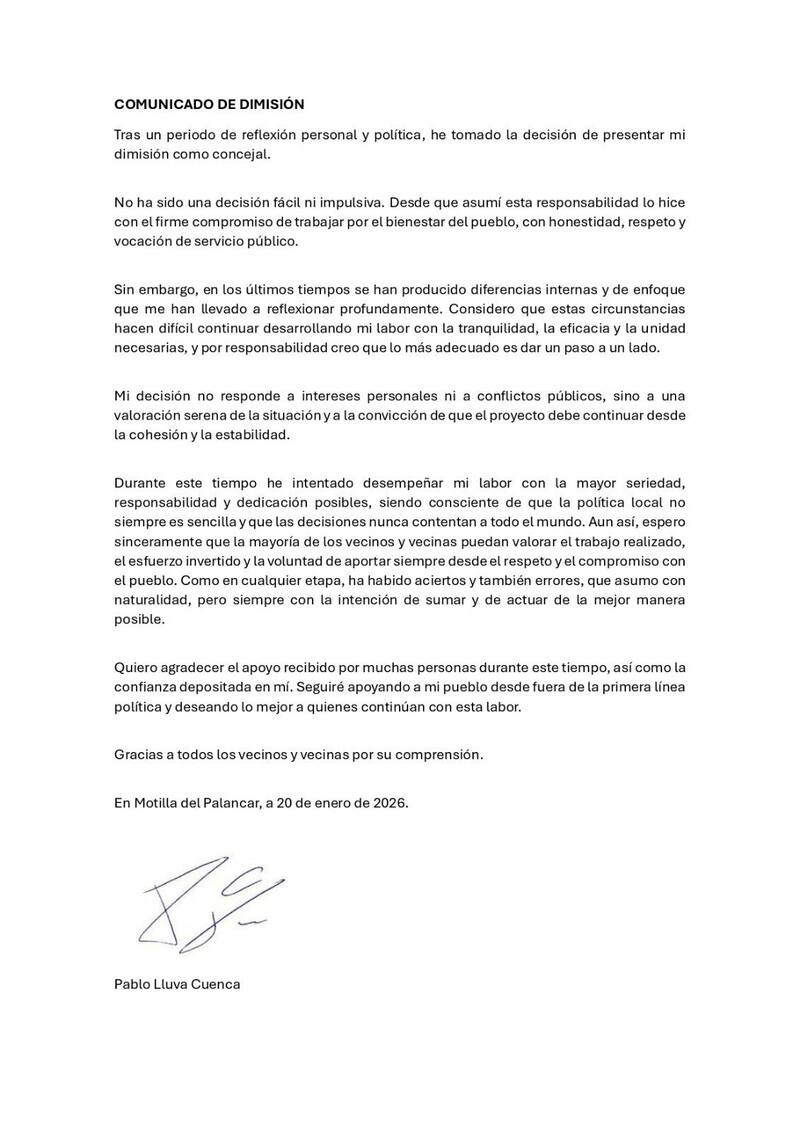 El concejal Pablo Lluva Cuenca ha anunciado su dimisión del cargo en el Ayuntamiento de Motilla del Palancar, poniendo fin a una etapa que, según ha explicado, ha estado marcada por el compromiso con el servicio público y el bienestar del municipio.