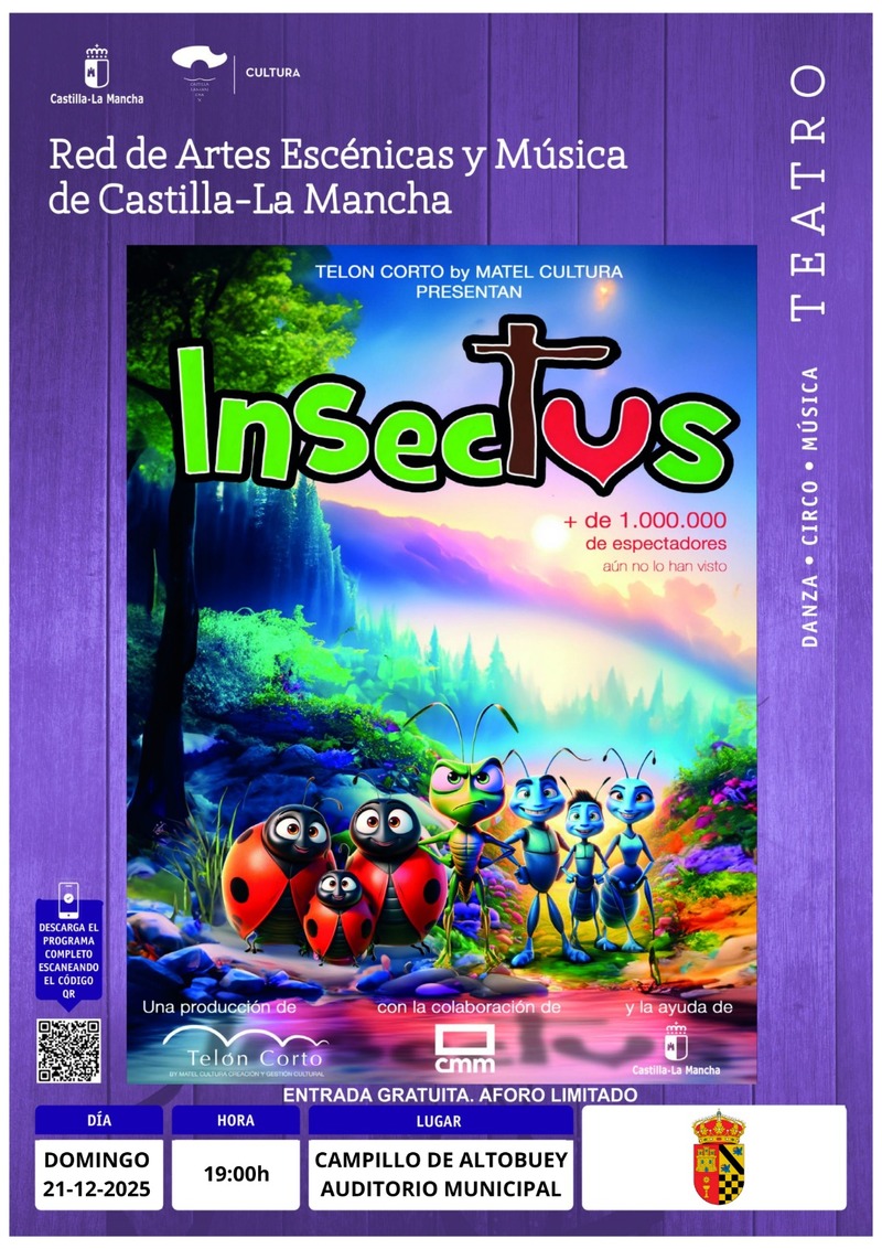 El domingo 21 de diciembre, también a las 19:00 horas, llegará la obra de teatro “InSectus”, con entrada gratuita y aforo limitado, ofreciendo una alternativa cultural para cerrar el fin de semana.