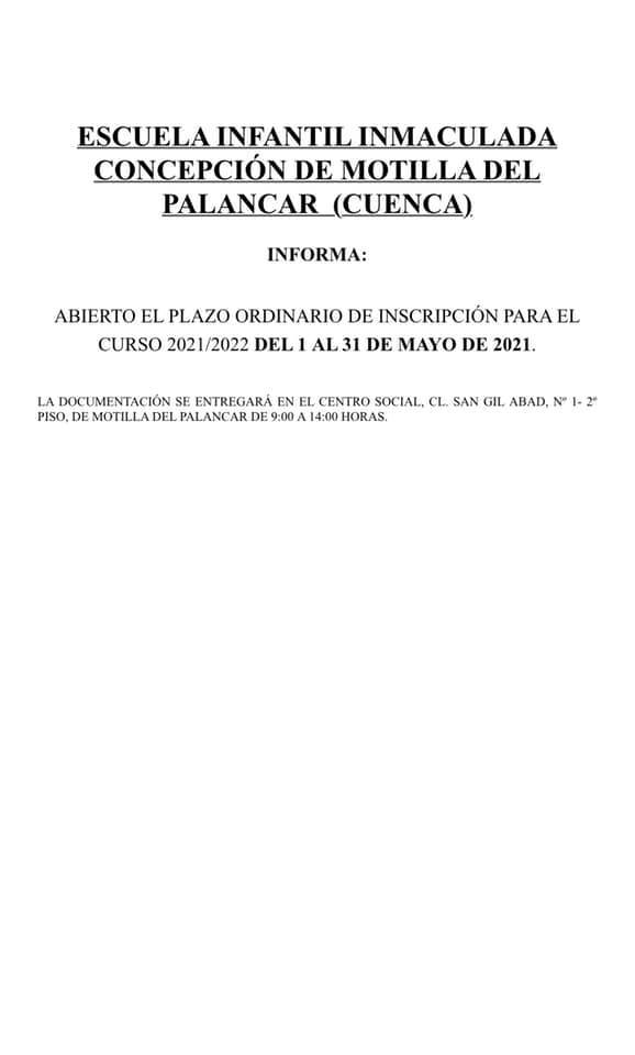 El Ayuntamiento de Motilla del Palancar ha confirmado la apertura del plazo ordinario de inscripción para el curso 2021/2022 en la Escuela Infantil Inmaculada Concepción de la localidad del 1 al 31 de mayo de 2021.