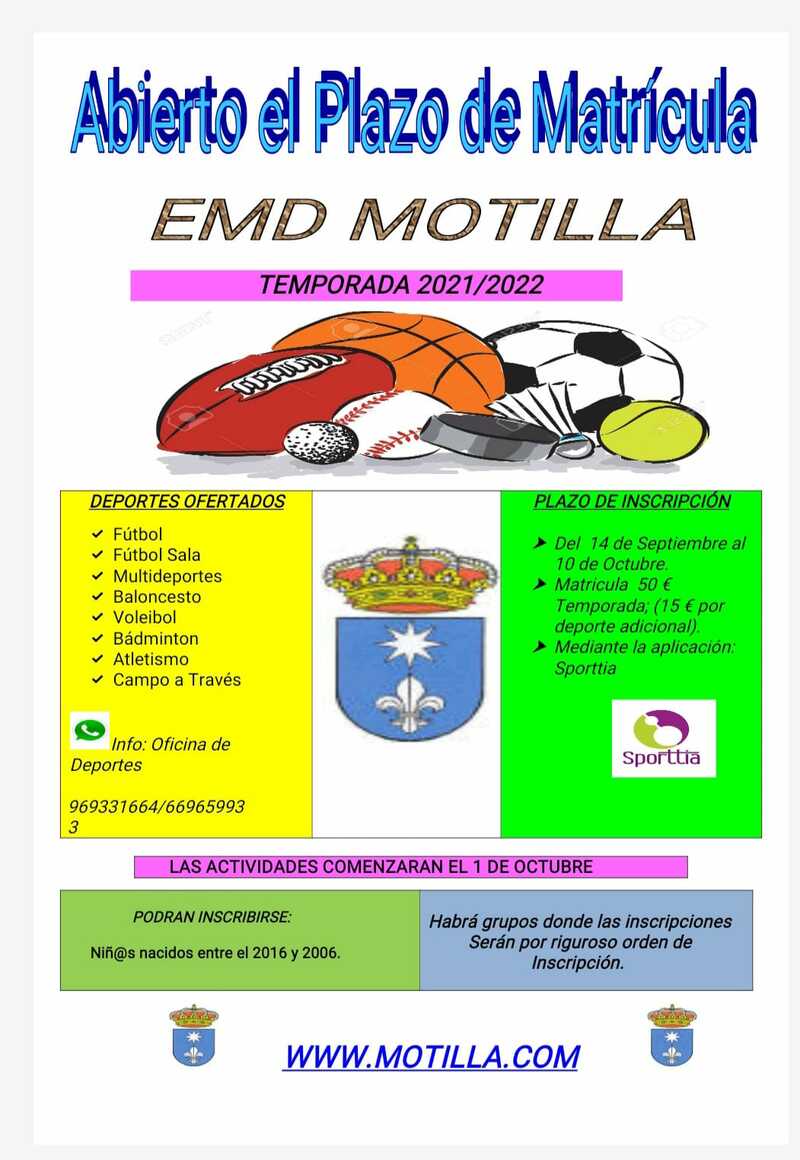 La Escuela Municipal de Deportes ha comunicado que ya está abierto el plazo de matrícula para la temporada 2021-2022. Podrán inscribirse l@s niñ@s nacidos entre el 2016 y 2006.