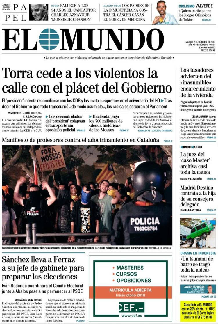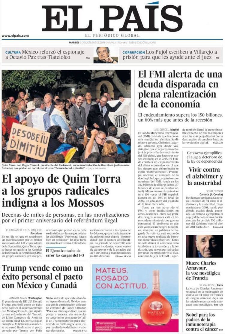 Principales portadas de hoy 2 de octubre de 2018