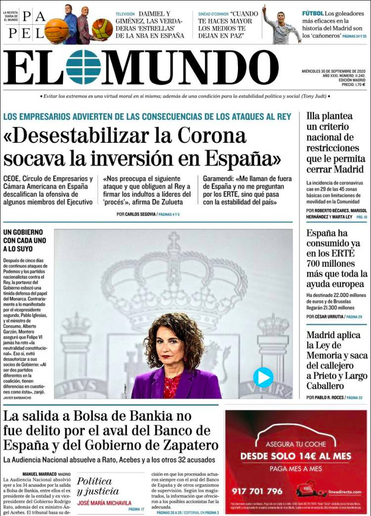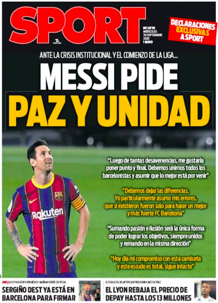 Principales portadas de hoy 30 de Septiembre de 2020