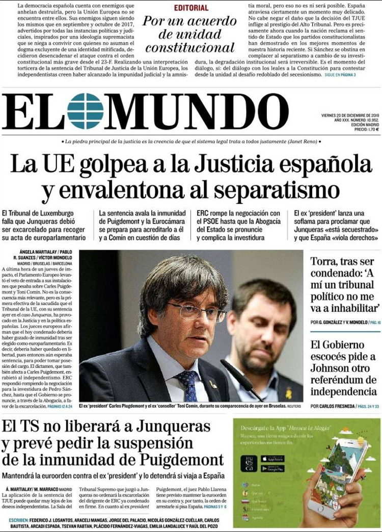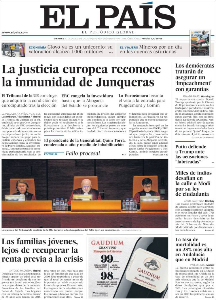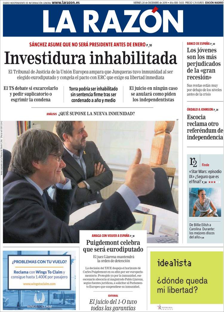 Principales portadas de hoy día 20 de Diciembre de 2019