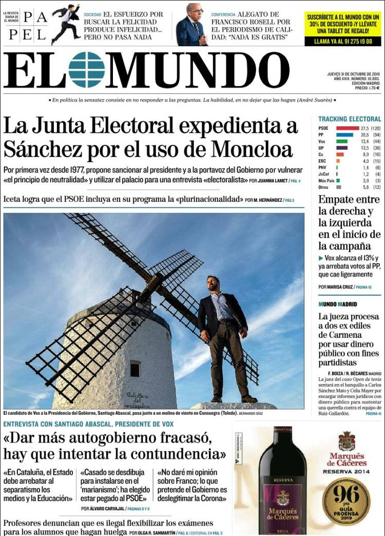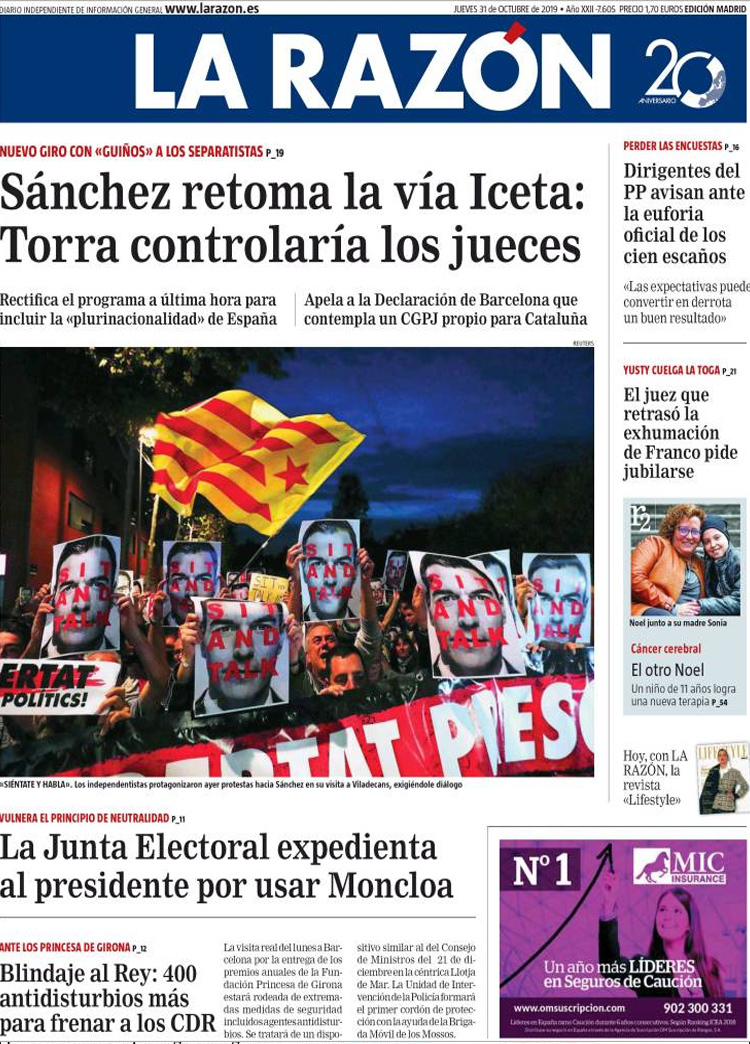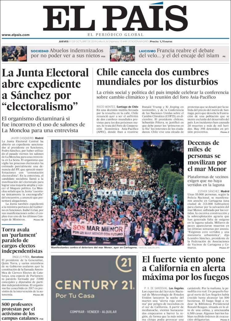 Principales portadas de hoy día 31 de Octubre de 2019