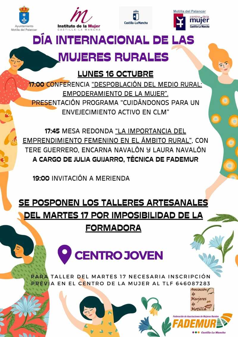 Todas las actividades de la Semana de las Mujeres Rurales se llevarán a cabo en el Centro Joven de Motilla del Palancar. ->>> TALLERES DEL DÍA 17 SE POSPONEN POR IMPOSIBILIDAD DE LA FORMADORA <<<-