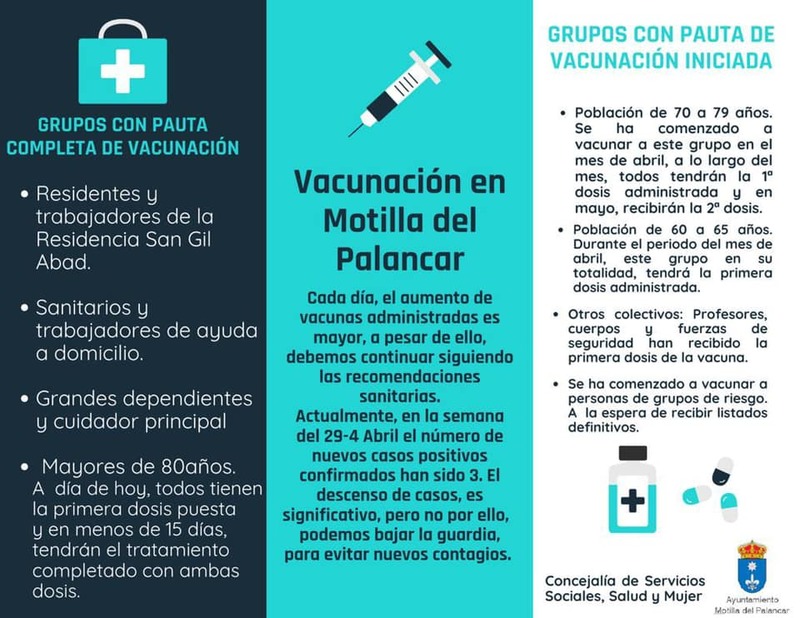 El Ayuntamiento de Motilla del Palancar ha compartido un tríptico realizado por la concejalía de Servicios Sociales, Salud y Mujer donde se puede encontrar toda la información actual de los grupos y colectivos que ya han sido vacunados con ambas dosis y los que ya han iniciado el programa con la primera dosis.