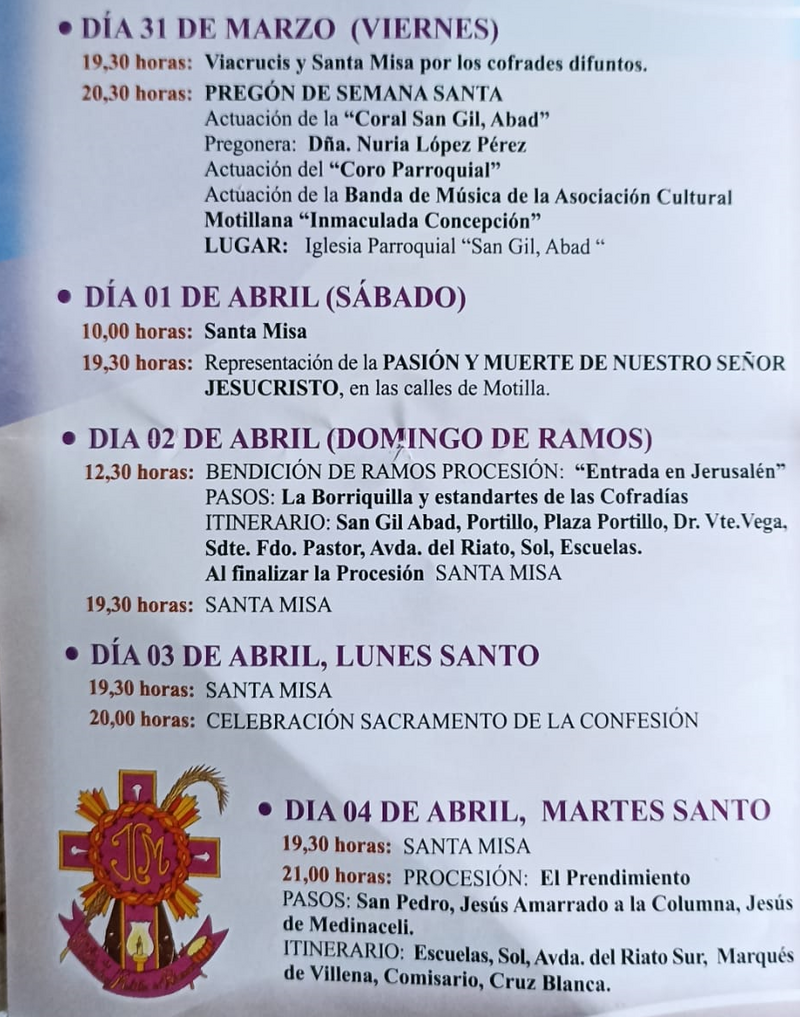 La programación dará comienzo el 31 de marzo con el Pregón de Semana Santa gracias a Nuria López Pérez. Ese mismo día actuarán la Coral San Gil Abad, el Coro Parroquial y la Banda de Música de la Asociación Cultural Motillana Inmaculada Concepción.