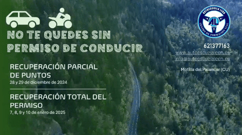 Ubicada en la Ctra. de La Roda, 33, la Autoescuela León es conocida por su compromiso con la seguridad vial y la profesionalidad. Este diciembre, los días 28 y 29, impartirá un curso para la recuperación parcial de puntos, ideal para quienes buscan restablecer su historial de conducción. Por su parte, el curso de recuperación total del permiso se llevará a cabo del 7, 8, 9 y 10 de enero de 2025.