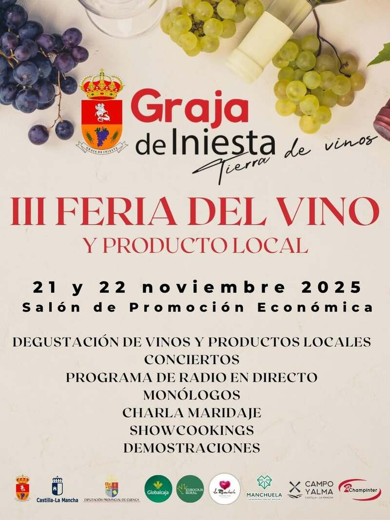 La III Feria del Vino de Graja de Iniesta tendrá lugar los días 21 y 22 de noviembre de 2025 con un programa ampliado y el apoyo del Gobierno regional y la Diputación de Cuenca. La cita reunirá a bodegas, productores y propuestas gastronómicas, con cerca de una veintena de actividades en dos escenarios.