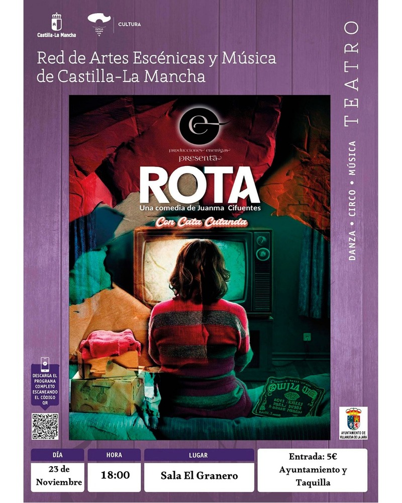 Villanueva de la Jara acogerá el espectáculo teatral Rota, una obra original de Juanma Cifuentes interpretada por Cata Cutanda. La función tendrá lugar el domingo 23 de noviembre a las 18:00 horas en la Sala El Granero. Las entradas están disponibles en el Ayuntamiento.