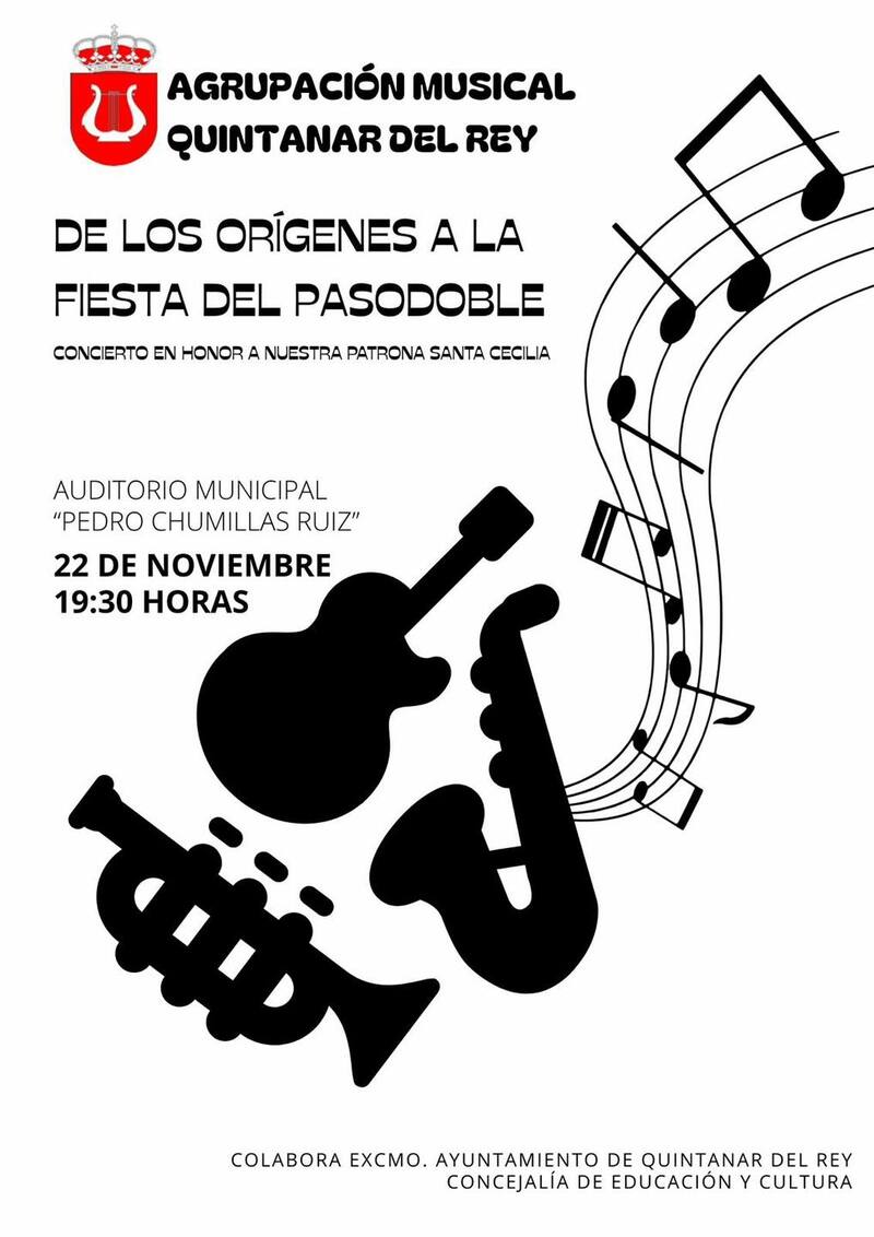 La Agrupación Musical Quintanar del Rey celebrará la festividad de Santa Cecilia los días 22 y 23 de noviembre con un programa que combina tradición y música. El sábado 22 tendrá lugar el traslado de la Virgen desde el local de ensayo hasta la Parroquia San Marcos a las 18:30 horas, seguido del concierto De los orígenes a la fiesta del pasodoble a las 19:30 horas en el Auditorio Municipal Pedro Chumillas Ruiz.