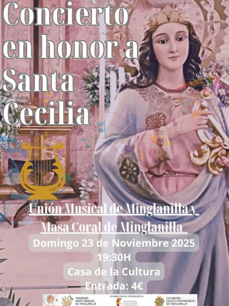 La Unión Musical de Minglanilla y la Masa Coral ofrecerán un concierto en honor a Santa Cecilia el 23 de noviembre a las 19:30 horas en la Casa de la Cultura. La entrada tendrá un precio de 4 euros.