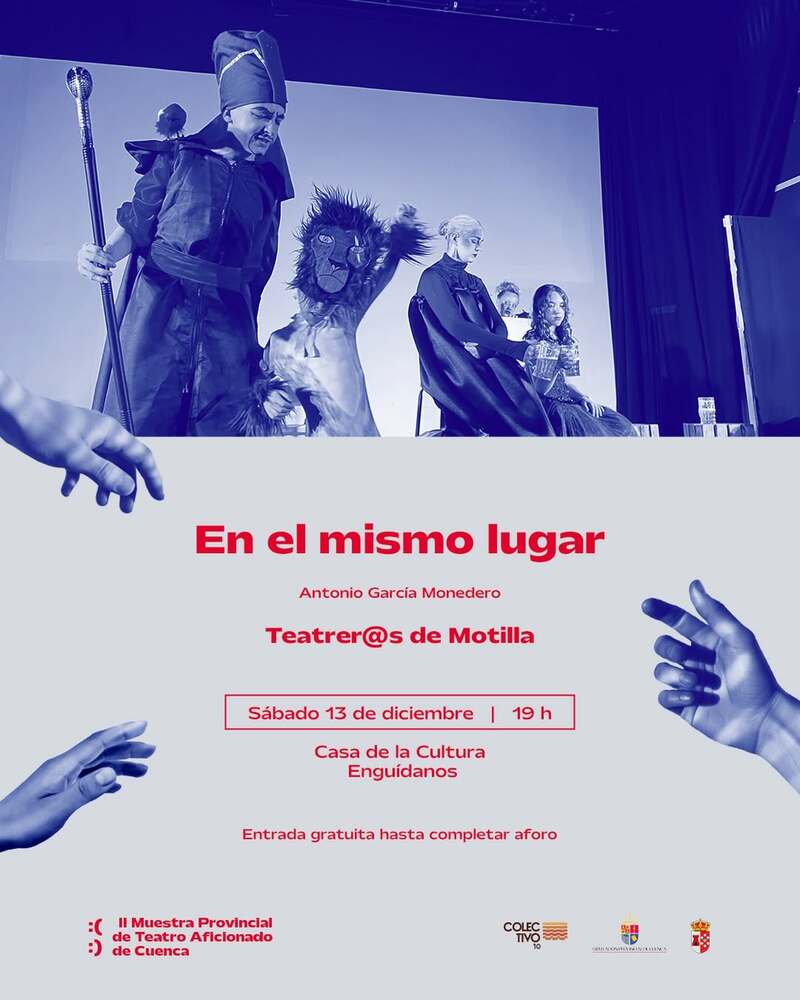 La Casa de la Cultura será escenario el sábado 13 de diciembre, a las 19:00 horas, de la representación de “En el mismo lugar”, una obra escrita por Antonio García Monedero e interpretada por el grupo Teatrer@s de Motilla. La función se enmarca dentro de la II Muestra Provincial de Teatro Aficionado de Cuenca y contará con entrada gratuita hasta completar aforo.