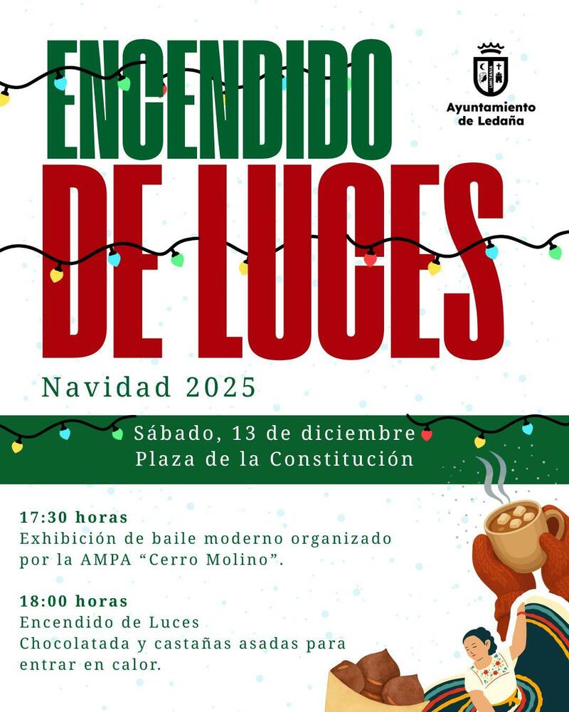 El sábado 13 de diciembre tendrá lugar el encendido de las luces de Navidad en la Plaza de la Constitución. A las 17:30 horas se celebrará una exhibición de baile moderno organizada por la AMPA “Cerro Molino”, seguida a las 18:00 horas del encendido oficial. La jornada se completará con chocolatada y castañas asadas.