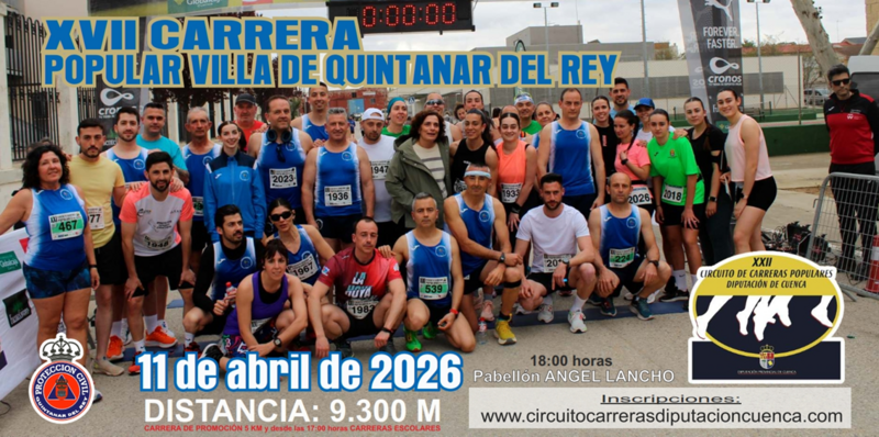 El próximo sábado 11 de abril, a partir de las 18:00 horas, se disputará la XVII Carrera Popular Villa de Quintanar del Rey, incluida como quinta prueba del Circuito de Carreras Populares de la Diputación Provincial de Cuenca. La salida y la llegada estarán situadas en el Polideportivo Municipal Ángel Lancho.
